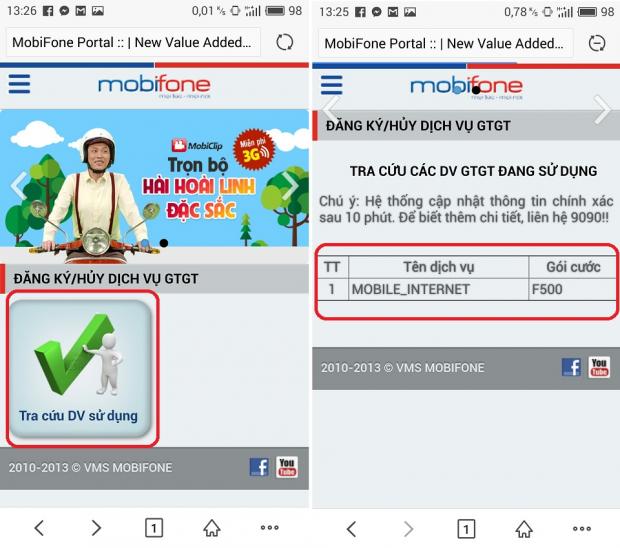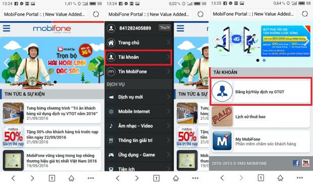 Các bạn truy cập theo đường link sau: wap.mobifone.com.vn, nếu truy cập trực tiếp từ điện thoại sử dụng 3G Mobifone bạn sẽ được miễn phí lưu lượng khi truy cập vào địa chỉ này và hệ thống sẽ tự động đăng nhập tài khoản. Tiếp đến truy cập vào mục Tài khoản -> Đăng kí/Hủy dịch vụ GTGT.
