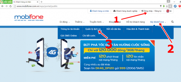 Đầu tiên truy cập theo đường link: mobifone.com.vn, đăng nhập tài khoản. Sau đó mở mục My Mobifone, tại đây các bạn chọn Quản lý dịch vụ.