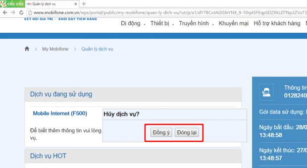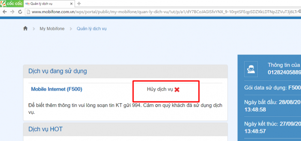 Hệ thống sẽ chuyển sang trang thông tin dịch vụ. Tại đây các bạn có thể theo dõi gói dịch vụ mình đang sử dụng. Ngoài ra, bạn còn có thể chủ động huy gói dịch vụ này nếu muốn.