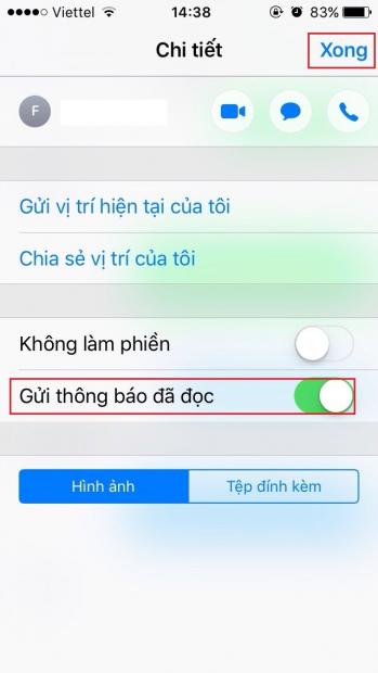 Bước 4: Lúc này, bạn sẽ thấy tùy chọn “Gửi thông báo đã đọc” đang được bật, việc của bạn là tắt tính năng này đi. Cuối cùng, bạn nhấn chữ Xong ở góc trên màn hình để kết thúc quá trình này.