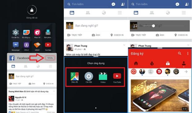 Bước 2: Ở mỗi tap ứng dụng sẽ xuất hiện nút chức năng có nhãn “Nhiều”, bạn chỉ việc chạm vào nút chức năng này, máy sẽ tự động chia đôi màn hình và gợi ý cho bạn những ứng dụng có thể thực hiện việc chạy song song.