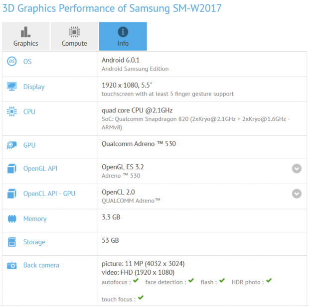 Ngoài thông tin nói trên, SM-W2017 còn sở hữu camera chính lên tới 12MP và camera phụ 5MP hỗ trợ selfie và gọi video. Theo GFXBench, máy sẽ được cài đặt sẵn hệ điều hành Android 6.0.1 Marshmallow ngay từ khi ra mắt.