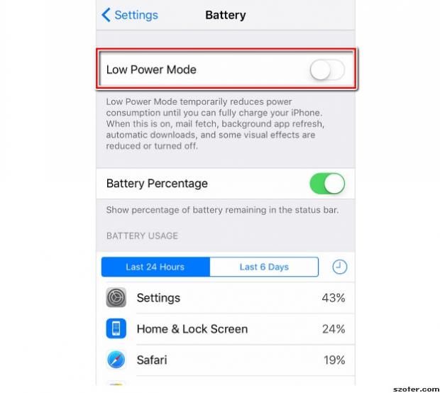 Vào Settings -> Battery, bật chế độ Low Power Mode trên để kéo dài thời gian sử dụng máy. Tuy nhiên, một ứng dụng như Mail, Siri, ứng dụng nền hay tự động update và một số hiệu ứng hình ảnh sẽ bị giảm bớt hoặc tắt hoàn toàn.