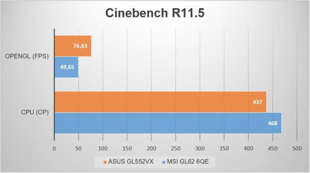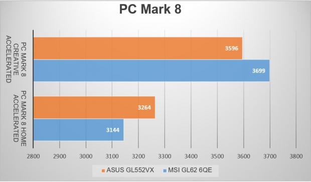 Kết quả khiến mình khá bất ngờ khi 2 sản phẩm chênh lệch 2GB ở bộ nhớ đồ họa, nhưng điểm đánh giá lại khá tương đồng. Cụ thể, ở PC Mark điểm đánh giá của GL62 và GL552 chỉ chênh nhau tầm 200 điểm. Tương tự đối với điểm đánh giá CPU và OpenGL, số điểm trên 400 của 2 sản phẩm cho thấy con chip BroadWell trội hơn hẳn so với chip dòng Haswell thế hệ trước.