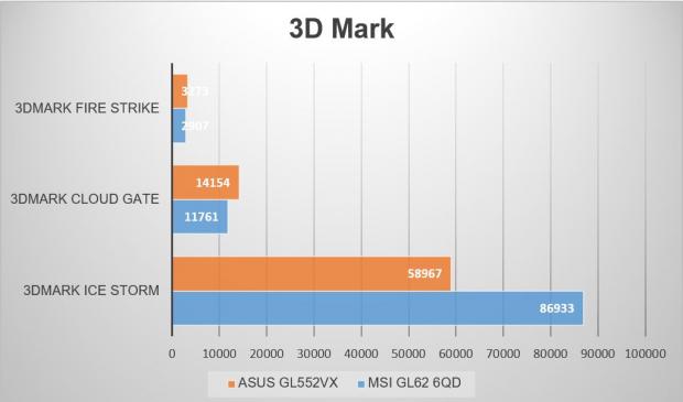 Ở khá năng xử lý đồ họa bằng 3D Mark ngoài điểm số ICE STORM cao vượt trội so với đối thủ của MSL GL62 thì các thang điểm còn lại đều không có nhiều khác biệt.