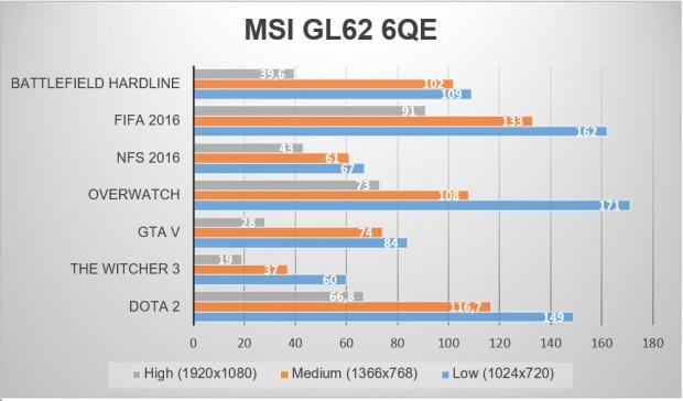 Với viên Pin 6 Cell, chiếc GL62 của MSI cho thời gian sử dụng vượt trội hơn hẳn so với ASUS GL552VX (4Cell). Cụ thể, cho cả hai máy chạy một bộ phim chuẩn HD 1080p, phát lại liên tục cho tới khi máy tắt, tắt kết nối Wifi, sử dụng tai nghe thay cho loa ngoài và để âm lượng 50%, độ sáng 50% cho máy chạy đến khi tự tắt (còn mức 10% pin) thì GL62 có thời gian đạt 3 giờ 38 phút và GL552 đạt 2 giờ 57 phút.