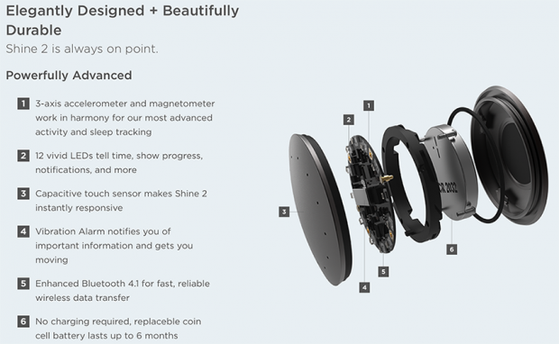Misfit Shine 2 về cơ bản là một thiết bị đeo dùng để theo dõi sức khỏe và quá trình tập thể dục thể thao của người đeo (Fitness Tracker). Nhưng nhà sản xuất đã cố gắng bổ sung thêm nhiều tính năng để Misift Shine không quá thua thiệt so với những loại smartwatch khác. Misift Shine 2 không có màn hình nhưng bù lại được tô điểm bằng 12 bóng đèn LED nhiều màu vừa có chức năng xem giờ, vừa có thể thông báo cuộc gọi (đèn màu xanh lá), tin nhắn (xanh dương) và báo hiệu kết quả luyện tập theo %. Thiết bị vẫn được làm bằng chất liệu nhôm sang trọng nhưng chiều dày được làm mỏng hơn so với bản cũ.
