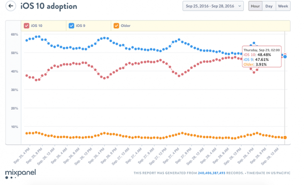Trước đây thì iOS 9 chỉ cần chưa đầy 2 tuần đã có mặt trên 50% thiết bị iOS và nó cũng là bản iOS có tốc độ cài đặt nhanh nhất từ trước đến nay. iOS 10 thì mất hơn hai tuần một chút, nhưng dù sao nó cũng cho thấy một điều rằng người dùng iOS luông giữ thói quen nâng cấp sớm lên hệ điều hành mới nhất, dù bản cài đặt iOS 10 lúc mới ra mắt có gặp một số lỗi nhỏ.