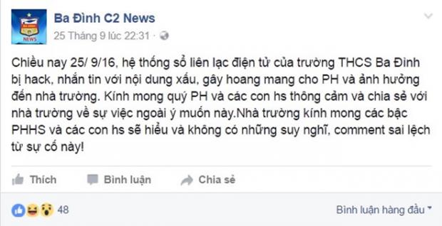 Thông báo trên fanpage của trườngĐược biết, ngày 25/9, cơ quan CSĐT công an quận Ba Đình có nhận được đơn trình báo của ban giám hiệu Trường THCS Ba Đình về việc hệ thống sổ liên lạc điện tử của trường bị người khác xâm nhập nhắn tin có nội dung xấu đề các phụ huynh, gây mất uy tín nhà trường.