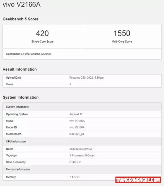 Chiếc điện thoại có số model V2166A xuất hiện trên Geekbench được cho chính là Vivo Y33s 5G, chiếc smartphone này được cung cấp sức mạnh từ chip MediaTek Dimensity 700 và kết hợp với GPU Mali-G57 MC2.