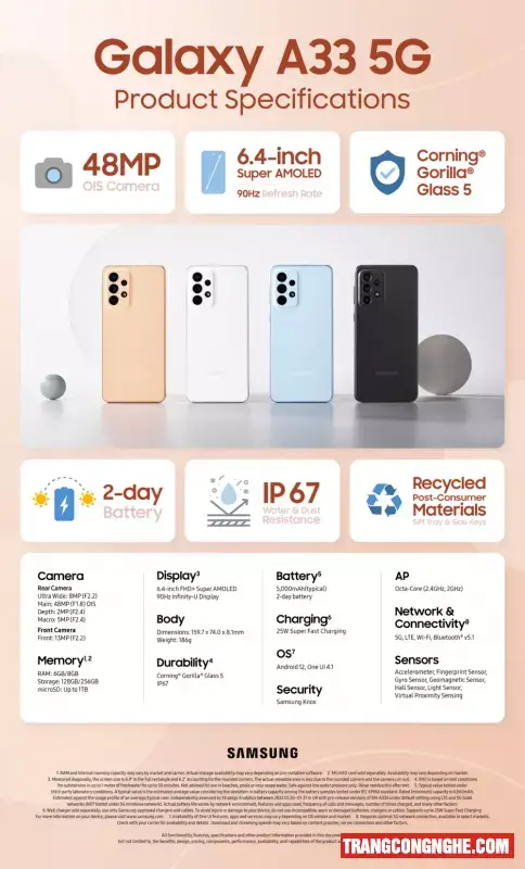 Galaxy A33 5G đã bị rò rỉ toàn bộ thông tin trên trang Appuals. Thiết bị sẽ có 4 màu: đen, xanh dương, hồng đào và trắng. Điện thoại có màn hình Super AMOLED Infinity-U 6,4 inch với độ phân giải Full HD + và tốc độ làm mới 90Hz được bảo vệ bởi Gorilla Glass 5.