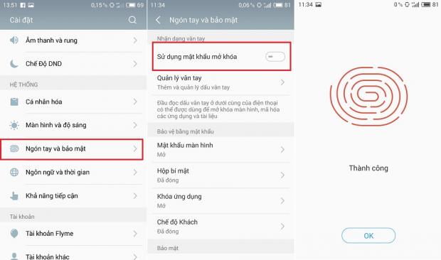 Các sản phẩm Meizu từ giá rẻ như Meizu M3s đến cao cấp như Meizu Pro 6 đều hỗ trợ cảm biến vân tay, vì vậy bảo mật dữ liệu bằng dấu vân tay không phải là vấn đề khó hăn với Meizu. Để khóa máy bằng vân tay các bạn thực hiện theo các bước sau: Cài đặt -> Ngón tay và bảo mật -> Sử dụng mật khẩu mở khóa -> Cuối cùng là nhấp nhiều lần lên phím home để máy quét ghi nhận lại dấu vân tay của bạn cho đến khi hoàn thành 100%.