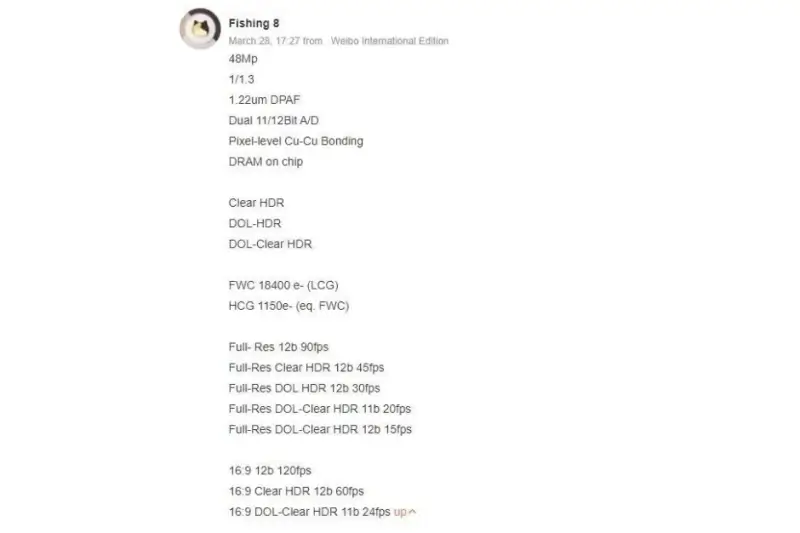 Theo một rò rỉ mới từ một tài khoản Weibo có tên Fishing 8, nó sẽ là cảm biến 1/1,3 inch với kích thước điểm ảnh 1.22µm. iPhone 13 Pro Max đi kèm với cảm biến chính 1/1,65 inch nhỏ hơn với điểm ảnh lớn hơn 1.9µm. Apple có thể sẽ sử dụng một công nghệ gọi là pixel binning để kết hợp dữ liệu từ nhiều pixel khi cần thiết, chẳng hạn như vào ban đêm.
