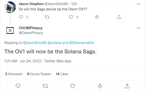 Đội ngũ sản xuất Essential PH-1 đã thành lập một công ty mới, đặt tên là Osom. Osom là một công ty công nghệ tập trung nhiều vào sự bảo mật. Công ty dự kiến sẽ sớm cho ra mắt sản phẩm đầu tay của mình là điện thoại OV1. Tuy nhiên, sau một loạt các sự kiện, OV1 giờ đây sẽ là một sản phẩm của Salana Mobile, với tên gọi mới là “Saga”. Solana Saga là một smartphone tập trung chủ yếu vào blockchain và hỗ trợ cộng đồng người chơi cryto.