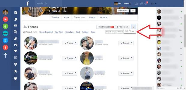 Trước tiên hãy đăng nhập trang Facebook cá nhân của bạn, tiếp đến truy cập vào mục Friends (Bạn bè). Tại đây, các bạn chọn vào mục Manage (Quản lý) biểu tượng cây bút, tiếp tục chọn Edit Privacy (Sửa quyền riêng tư).