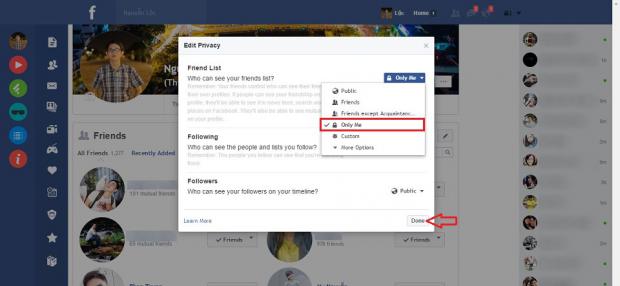 Tại hộp thoại Edit Privacy, trong phần Friend List (Danh sách bạn bè), với câu hỏi Who can see your friends list (Ai có thể thấy danh sách bạn bè của bạn), tick chọn Only me (Chỉ mình tôi). Sau đó bấm Done (Xong), như vậy là danh sách bạn bè trên Facebook đã được “bảo vệ” và chẳng còn thông tin gì có thể bị soi mói nữa.