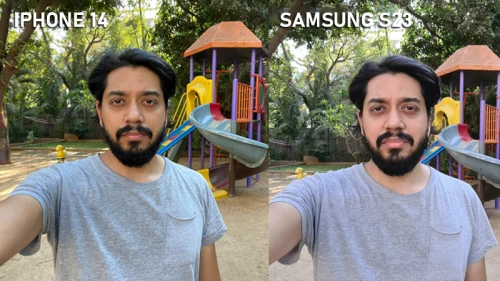 Trong một bức chân dung ban ngày, Samsung S23 làm mịn chi tiết quần áo, điều này thật đáng tiếc, trong khi iPhone giữ những chi tiết đó sắc nét. Trong một ví dụ khác, Samsung S23 giữ chủ thể sắc nét ở một cái cây cách vài bước chân, trong khi iPhone làm mờ nó một chút, một lần nữa, cho kết quả chân thực hơn.