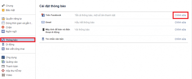 Tiếp theo, bạn tìm đến mục Thông báo tại menu bên trái. Nhìn sang bên phải tại dòng Trên Facebook chúng ta nhấn chọn vào mục Chỉnh sửa.