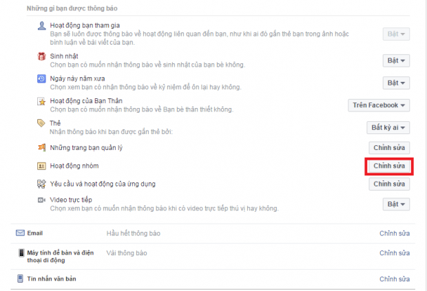 Sau khi chuyển sang giao diện mới hãy tìm mục Hoạt động nhóm tại Những gì bạn được thông báo và chọn chỉnh sửa.