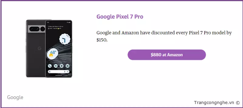Nếu bạn đang có nhu cầu tìm kiếm một chiếc điện thoại Android mới, bây giờ là thời điểm tốt để mua một trong những sản phẩm tốt nhất với giá giảm đáng kể. Google đã giảm giá cho toàn bộ dòng sản phẩm Pixel, bao gồm cả flagship 7 Pro. Trên cả Amazon và Google Store, bạn có thể mua được Pixel 7 Pro giảm giá $150. Bao gồm tất cả các màu sắc và dung lượng lưu trữ, có nghĩa là các mô hình 128GB, 256GB và 512GB có giá bán là $749, $849 và $949 hiện tại. Phiên bản rẻ hơn là Pixel 7 cũng được giảm giá $150. Một lần nữa, tất cả ba màu sắc được bao gồm trong khuyến mãi, cả hai biến thể dung lượng lưu trữ. Vì vậy, bạn có thể mua được model 128GB với giá $449 và model 256GB với giá $549. Khi không giảm giá, hai mô hình này sẽ có giá lần lượt là $599 và $699. Cuối cùng, Pixel 6a cũng giảm giá $150, giá chỉ còn $299.![]()