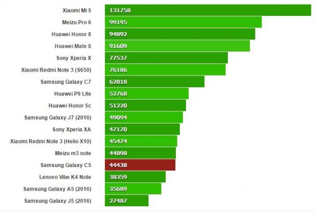 Theo đó, trên AnTuTu 6, Galaxy C5 đã đạt điểm hiệu suất tổng thể là 44.438 điểm. Với điểm số này, Galaxy C5 vượt qua Lenovo K4 Note, Galaxy A5 2016 (Exynos 7580) và Galaxy J5 2016 (Snapdragon 410).