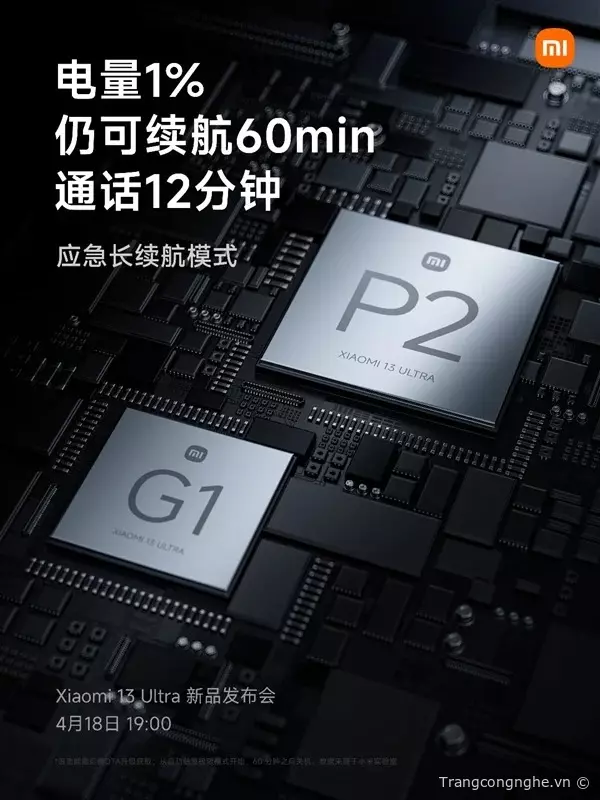 Trước khi chính thức ra mắt vào ngày 18/4, Xiaomi đã tiết lộ một số tính năng nổi bật của flagship của họ, đặc biệt là khả năng tiết kiệm pin. Theo các báo cáo, Xiaomi 13 Ultra sẽ được trang bị hai con chip tự sản xuất là Surge P2 và Surge G1. Surge P2 là phiên bản nâng cấp của chip Surge P1 trên Xiaomi 12, với khả năng quản lý nhiệt hiệu quả hơn và tăng cường hiệu suất sạc.