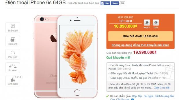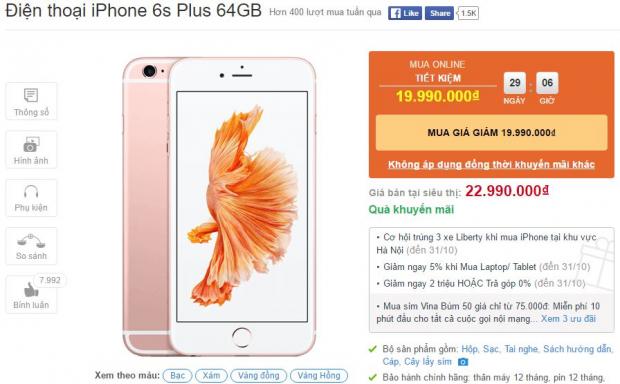 Theo đó, trong chương trình mua online giá tiết kiệm tại Thế giới di động, phiên bản iPhone 6s, 6s Plus 64 GB được giảm giá tới 3 triệu đồng, từ 19.99 triệu xuống còn 16.99 triệu đồng và từ 22.99 triệu xuống còn 19.99 triệu, hấp dẫn quá phải không nào? Chương trình này sẽ áp dụng trong hơn 29 ngày nữa.