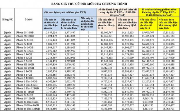 Trái ngược lại, mức giá mua lại iPhone của Samsung lại quá 'bèo bọt'. Trong khi một số dòng máy như iPhone 5, 5c, 5s được Samsung mua lại với giá thấp hơn thị trường khoảng từ 500 nghìn - 1 triệu, thì khoảng cách này trở nên rất lớn với các máy cao cấp. Đặc biệt, iPhone 6s Plus 128GB chỉ được Samsung mua lại với giá 9.6 triệu nếu máy hoạt động tốt, và... 2.8 triệu nếu máy vỡ màn hình. Hiện tại, iPhone 6s Plus 128GB có giá khoảng 15 triệu cho máy cũ.