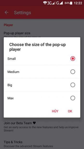 Hơn nữa, bạn có thể chỉnh kích thướt video theo sở thích của mình ở phần Settings -> Pop-up player size.