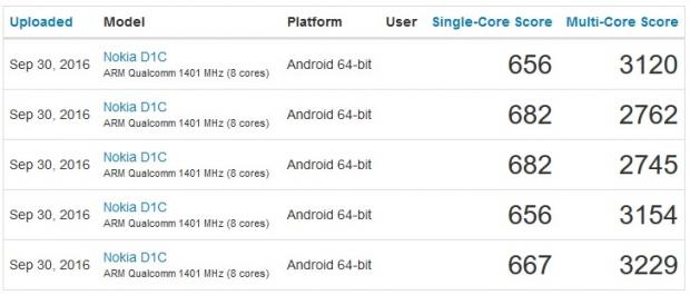 Và giờ đã là quý 4, những thông tin đầu tiên bắt đầu xuất hiện. Một thiết bị Nokia bí ẩn, chạy hệ điều hành Android 7 đã xuất hiện trên trang kết quả của chương trình đo hiệu năng (benchmark) nổi tiếng Geekbench. Thiết bị này có tên là Nokia D1C.