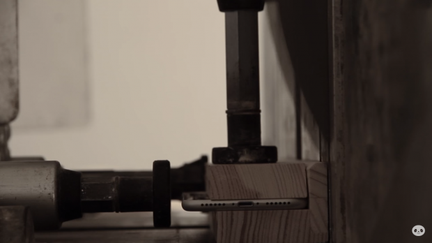 Chiếc iPhone được ép chặt để mài nhẵn hai cạnh trên dưới và hai cạnh bên