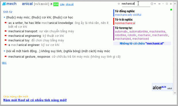 Được đánh giá là một trong những phần mềm có thư viện từ vựng phong phú, nhiều chủ đề khác nhau, đồng thời dữ liệu được cập nhật liên tục mang tới nguồn từ vựng dồi dào cho người dùng. KOOL Dictionary có khả năng hiển thị thông tin về nghĩa, từ loại, từ đồng nghĩa, trái nghĩa với những từ được tra, tìm kiếm thông minh với các từ đã bị chuyển dạng như so sánh hơn, so sánh nhất, số nhiều, thì quá khứ,… Trong phần dịch nghĩa từ bạn có thể tra thêm được nhiều từ ngữ và các thành ngữ tiếng Anh có trong kho tư liệu có sẵn. Ngoài ra, KOOL Dictionary cũng cho phép bạn thêm từ mới, nhập một số lượng lớn từ vựng từ Excel để bạn có thể tự xây dựng bộ từ điển cho riêng mình. Bạn cũng có thể nghe phát âm chính xác với mỗi từ được tra để vừa nắm được nghĩa, vừa học cách phiên âm của người bản địa.