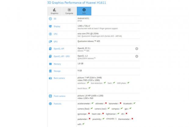 Như hình ảnh các bạn có thể thấy, smartphone mới của Huawei sẽ được cài đặt sẵn Android 6.0.1 Marshmallow và cấu hình ở mức tầm trung. Máy sở hữu một màn hình 6 inch độ phân giải tiêu chuẩn HD 720p, chip xử lý 8 nhân Qualcomm Snapdragon 615 tốc độ 1.5GHz đi kèm là 2GB RAM và 16GB bộ nhớ trong.