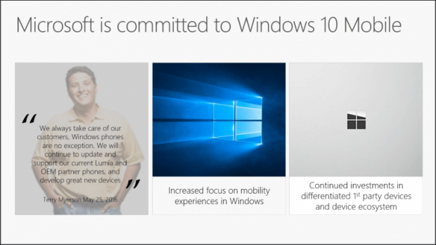 Theo báo gần đây cho biết, Microsoft có thể sẽ dừng sản xuất các dòng sản phẩm Lumia. Tuy nhiên, những slide của Phó chủ tịch Windows trong buổi hội nghị vừa rồi đã nói rằng sẽ vẫn hỗ trợ lâu dài các thiết bị chạy Windows 10 Mobile và cố gắng phát triển thêm. Hơn nữa, các slide này nhầm trấn an tinh thần người dùng Windows Phone rằng: Microsoft sẽ vẫn phát triển hệ điều hành này của mình chứ không hề có ý định khai tử hay bỏ bê nó.