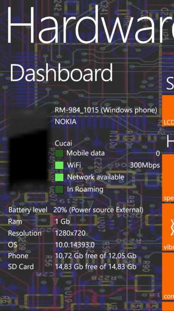 Sau khi mở ứng dụng lên, 'đập vào mắt' chúng ta đó chính là phần Dashboard. Đây chính là thông tin tổng quát về chiếc Windows Phone mà anh em đang sử dụng. Gồm có: Pin, RAM, độ phân giải, phiên bản hệ điều hành, bộ nhớ và các kết nối...