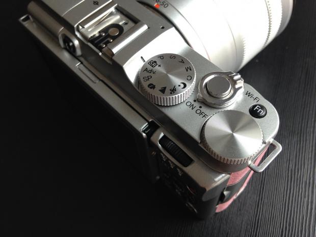 Có một điểm trừ là lẫy chuyển để bật/tắt máy khá cứng, bề mặt của lẫy và nút bấm chụp được mạ chrome bóng nên gần như bạn sẽ không thể thao tác nếu như tay bạn bị ướt hay trơn. Logo WiFi được in phía trên để cho người dùng biết chiếc X-A2 hỗ trợ kết nối WiFi.