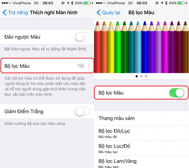 Trong mục trợ năng tìm đến chọn tính năng Thích nghi màn hình > Bộ lọc màu.