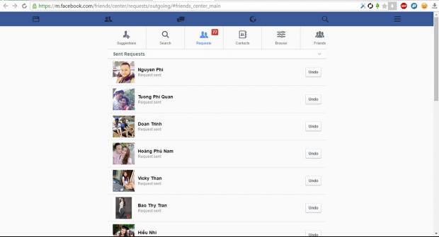 Cách 2: Truy cập vào đường link này, đây là giao diện mobile, muốn hủy lời mời kết bạn với người nào chỉ cần ấn vào undo rất nhanh chóng.