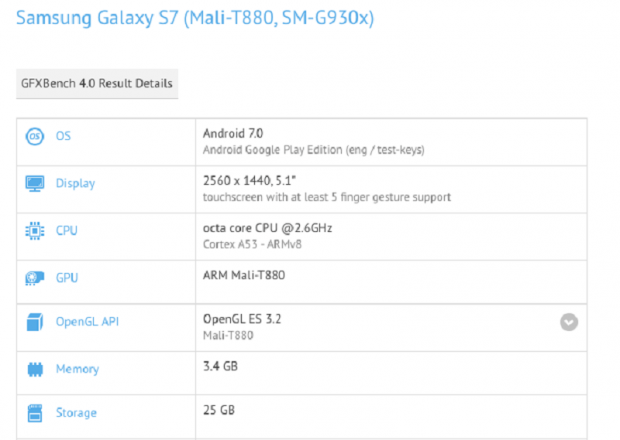 GFXBench vừa đăng tải hình ảnh các thông số kĩ thuật của Samsung Galaxy S7 kèm theo thông tin hệ điều hành Android 7.0. Khoảng hai tuần trước Samsung đã bắt đầu thử nghiệm Nougat cho Galaxy S7 và Galaxy S7 Edge ở Ba Lan, hình ảnh trên có thể gợi ý rằng không lâu nữa dòng smartphone này sẽ được nâng cấp lên Android 7.0