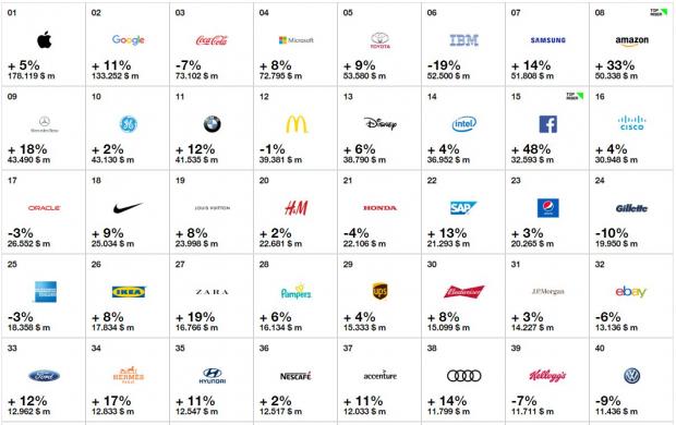 Bên cạnh Apple, Google, Microsoft thì IBM, Samsung và Ge là 3 hãng công nghệ còn lại nằm trong top 10. Hãng xe hơi Toyota cùng với Mercedes-Benz lần lượt chiếm lĩnh hai vị trí thứ 5 và thứ 9 trong khi đó trang web thương mại điện tử Amazon tiếp tục có một năm thành công khi giá trị thương hiệu tăng 33%.