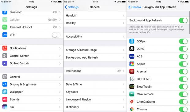 - Tắt tính năng tự làm mới ứng dụng chạy nền trong Settings (Cài đặt) > General (Cài đặt chung) > tắt “off” Background App Refresh. Hoặc bạn có thể chỉ chọn một vài ứng dụng thường xuyên sử dụng, và cần cập nhật liên tục để tiết kiệm một phần năng lượng.