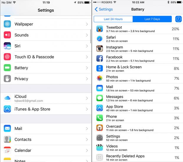 - Theo dõi danh sách ứng dụng để tìm ra những “thủ phạm” gây hao pin nhất tại Settings (Cài đặt) > Battery (Pin), gợi ý của mình là bạn hãy để mắt đến Facebook, Twitter và các ứng dụng dịch vụ âm nhạc trực tuyến.