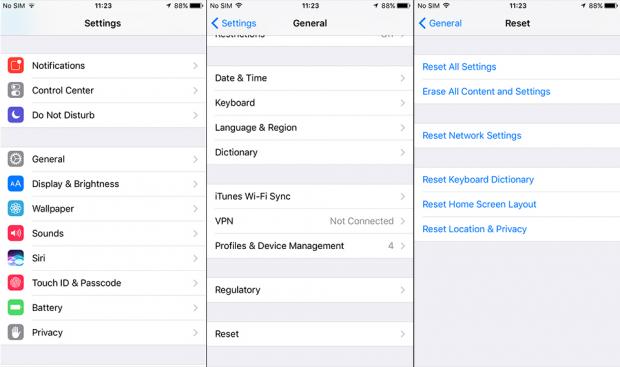 Vào Settings (Cài đặt) > General (Chung) > Reset > Reset Network Settings. Lệnh reset này sẽ không xóa các dữ liệu khác trong máy bạn ngoài những kết nối không dây sẽ trở lại với các thiết lập mặc định.
