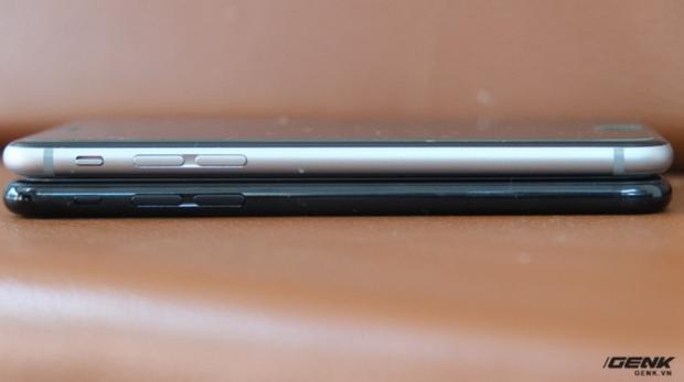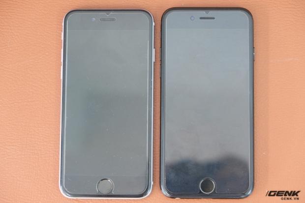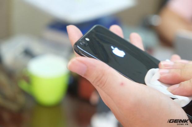 Lớp vỏ này bóng bẩy chẳng kém gì iPhone 7 Jet Black, cho cảm giác trên tay gần như là y hệt. Và nó bám vân tay chẳng kém gì hàng xịn, khiến chúng tôi liên tục phải lau chùi