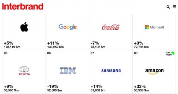 Như thường lệ, Apple vẫn chiếm vị trí số 1. Năm 2016, theo Interbrand, nhà sản xuất iPhone tăng 5% giá trị thương hiệu, đạt 178 tỷ USD.