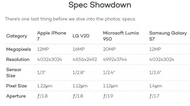 Trên trang iMore, 13.000 người này chủ yếu là fan hâm mộ Apple và để công bằng nhất, iMore đã chụp các bức ảnh giống nhau từ các camera của iPhone 7, LG V20, Lumia 950 và Galaxy S7, sau đó trang này đăng tải và để người dùng lựa chọn xem ảnh nào đẹp nhất. Tất nhiên, những người tham gia không biết hình ảnh nào là của smartphone nào (chỉ công bố sau khi cuộc khảo sát hoàn thành).