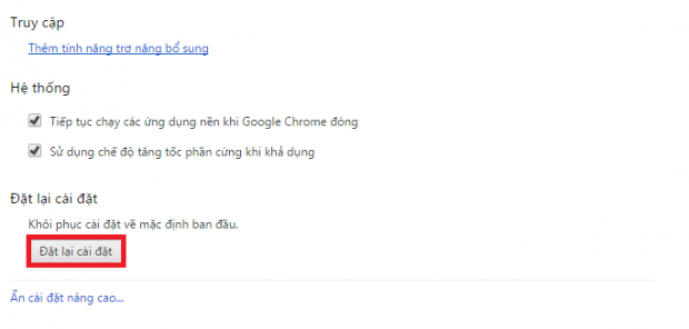 Ở Bảng tiện ích các bạn vào phần cài đặt (ở góc bên trái). Kéo xuống rồi chọn Hiện thị cài đặt nâng cao và chọn “Đặt lại cài đặt trình duyệt“.