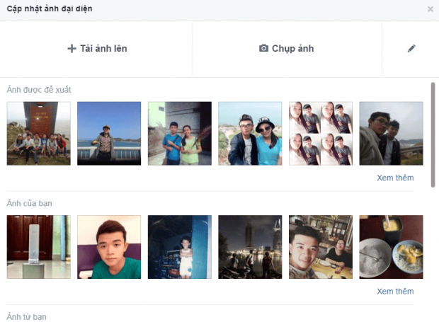 Xuất hiện giao diện hộp thoại Cập nhật ảnh đại diện. Tại đây, chúng ta có thể tải lên một ảnh mới, lựa chọn những ảnh trước đó đã tải lên hoặc Chụp ảnh để làm ảnh đại diện mới cho Facebook.