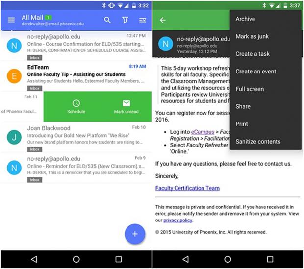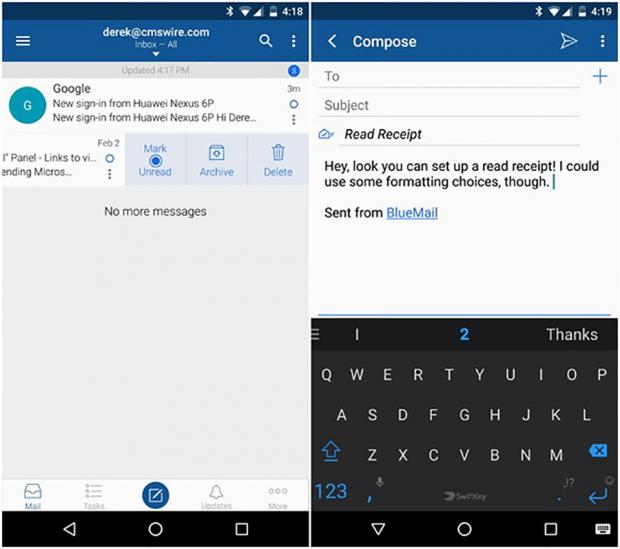 Ứng dụng này cũng tương tự như Boomerang, đó là nó nhấn mạnh để việc thông báo về một bức đã đọc để chúng ta không quên một việc gì đó. Tuy nhiên, nếu như Boomerang chọn cách dùng mail server của mình để gửi thư lại vài tài khoản của chúng ta thì Blue Mail hoạt động đơn giản hơn: đẩy email lên đầu, kèm theo thông báo 'đã đến thời gian'. Tất nhiên là thông báo này sẽ xuất hiện ngoài khu vực Notification của Android nên bạn có thể thấy nó một cách dễ dàng. Nút hẹn giờ được bố trí rõ ràng ngay trong giao diện xem nội dung mail, và bạn cũng có thể trượt ngón tay ở danh sách các thư đến để hẹn giờ nhắc nhở. Giao diện của Blue Mail cũng rất đẹp và đơn giản, quan trọng hơn hết là nó hoạt động nhanh và rất ổn định.