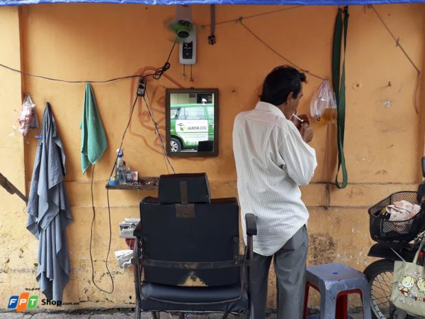 Một tiệm hớt tóc vỉa hè với ông chủ nhìn rất phong trần.